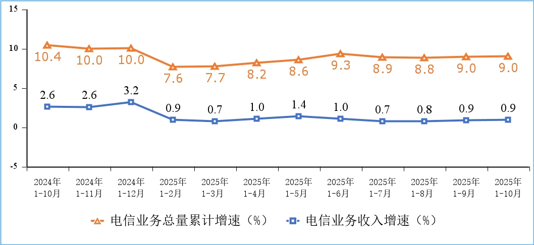 电信业务量收平稳增长。前10个月,电信业务收入累计完成14670亿元,同比增长0.9%。按照上年不变价计算的电信业务总量同比增长9%。